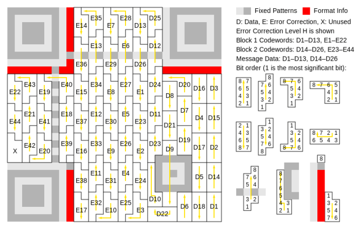 Kod için yük (veri ve sağlama toplamı verileri) daha sonra kontrol öğelerinin etrafındaki ızgara boyunca zig-zag çizilir.